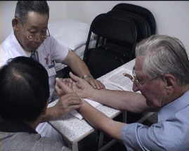 Hier wird für die Ganzkörperdiagnose der Pulsnahme an beiden Handgelenken gezeigt.