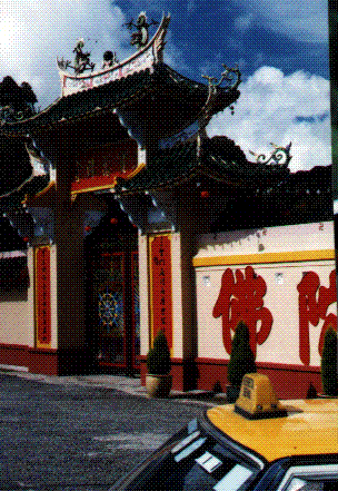eine haushohe zentrale Buddhastatur. Im hinteren Tempelgebäude sind die Wände