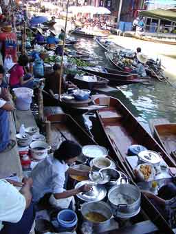 Ab 07.00h wimmelt es von kleinen Händlerbooten, die ihre Warenverkaufen - von Obstverkäufer bis zum Fleischer - wollen. Daneben sind noch Küchenboote unterwegs, die leckere Eßwaren anbieten.