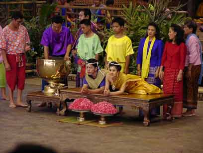 Um 14.45h beginnt eine einstündige Show - s.o.-. Es werden Thai-Boxen, traditionelle Tänze, Thai-Hochzeit, Ordination eines Mönches und vieles andere geboten.